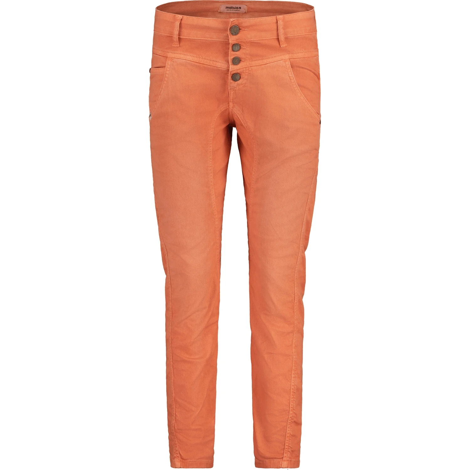 Garment Dye Pants with turned side seam, two front slash pockets and one coin pocket, two back patch pockets, low waist fit and slim leg, eye-catching front button placket. Small Maloja patch on the right back pocket.
