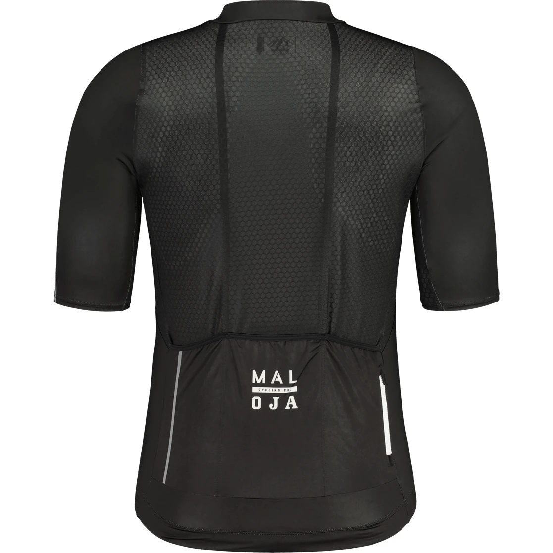 For DomM. we developed a new race cut with a shorter front, long sleeves, shortened shoulders and a tight fit. The Pushlite fabric is very soft and comfortable, at the back and the bottom of the sleeves. Honeycomb Mesh provides maximum ventilation. Three back pockets, full-length front zipper, reflective prints on the back pocket and sleeve. Split Maloja lettering on the shoulder.