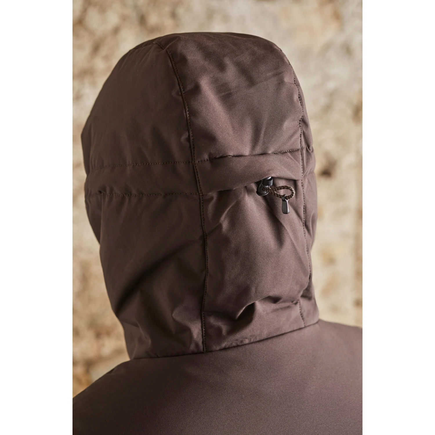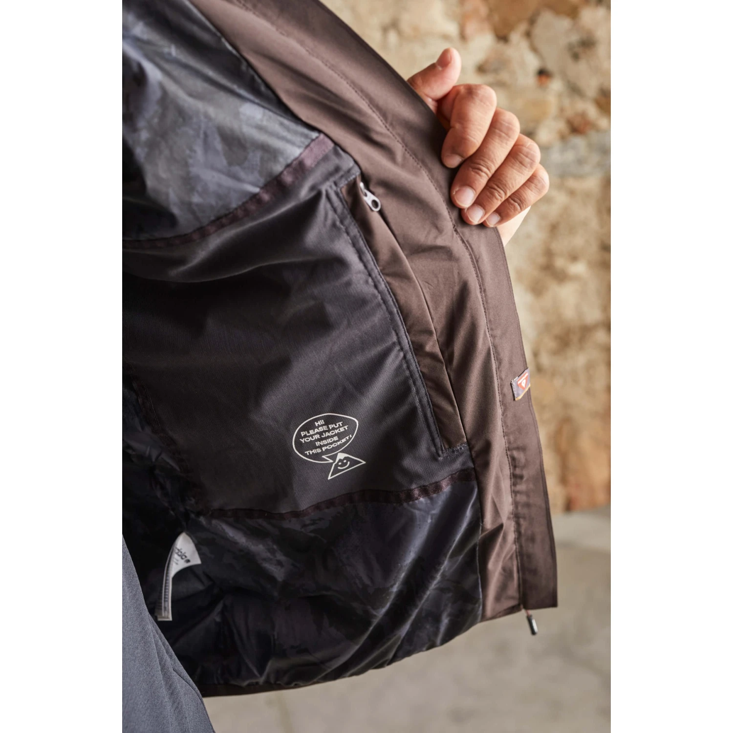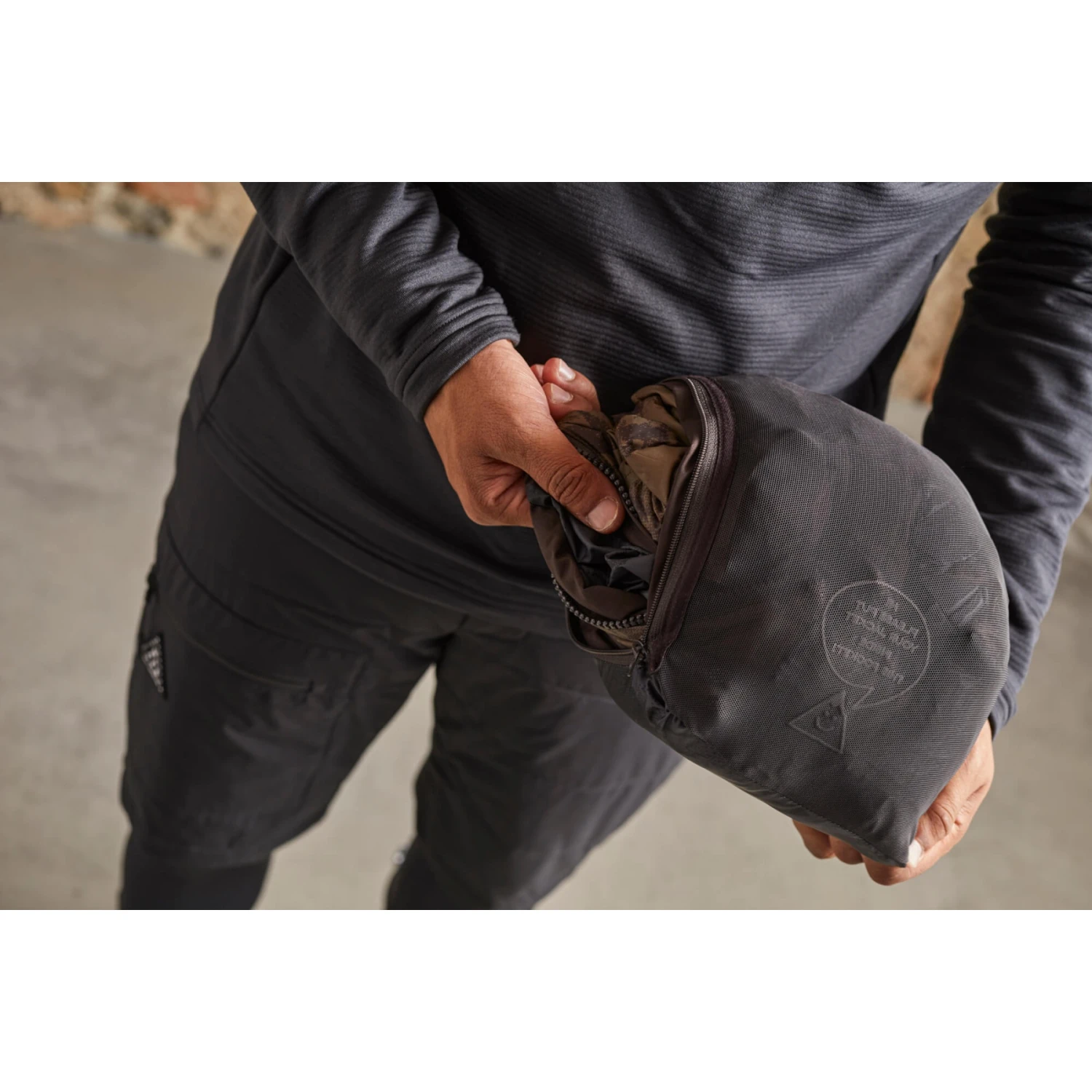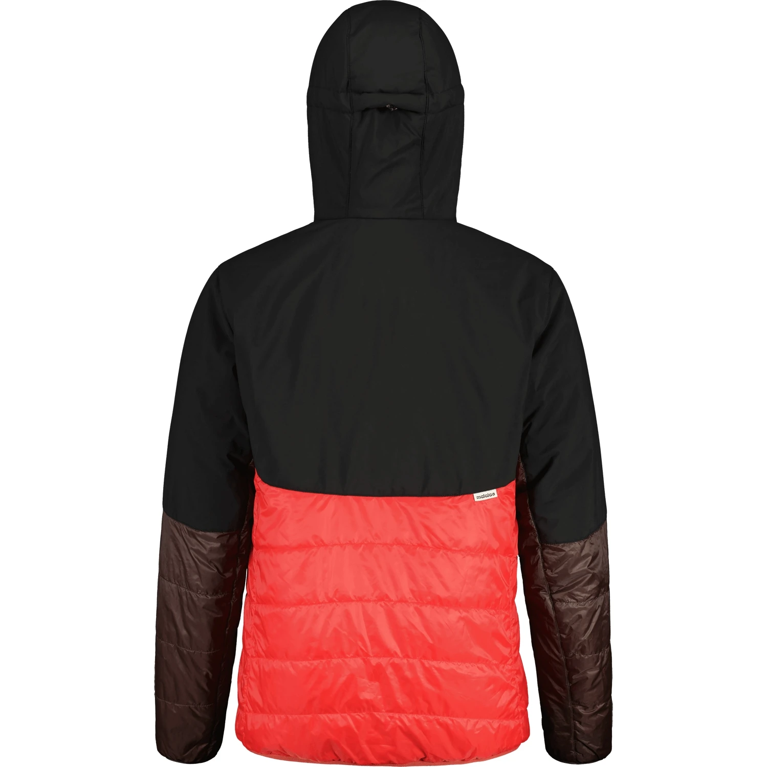 With its Primaloft Gold padding, the small packable insulated jacket provides cozy warmth, in the upper part the Stormshell material provides good weather protection. Two side zipper pockets above the backpack strap, reflective cuffs, waistband and hood, Mountain People patch on the chest.