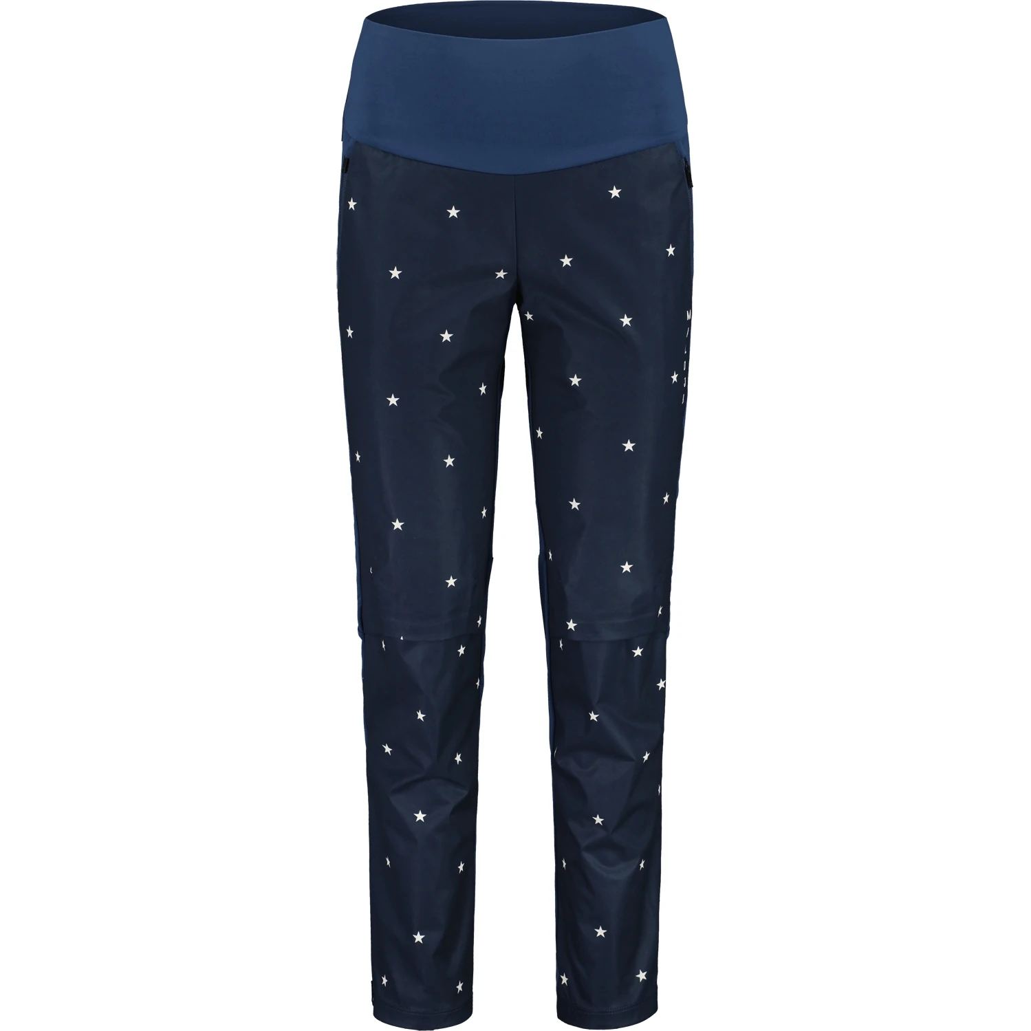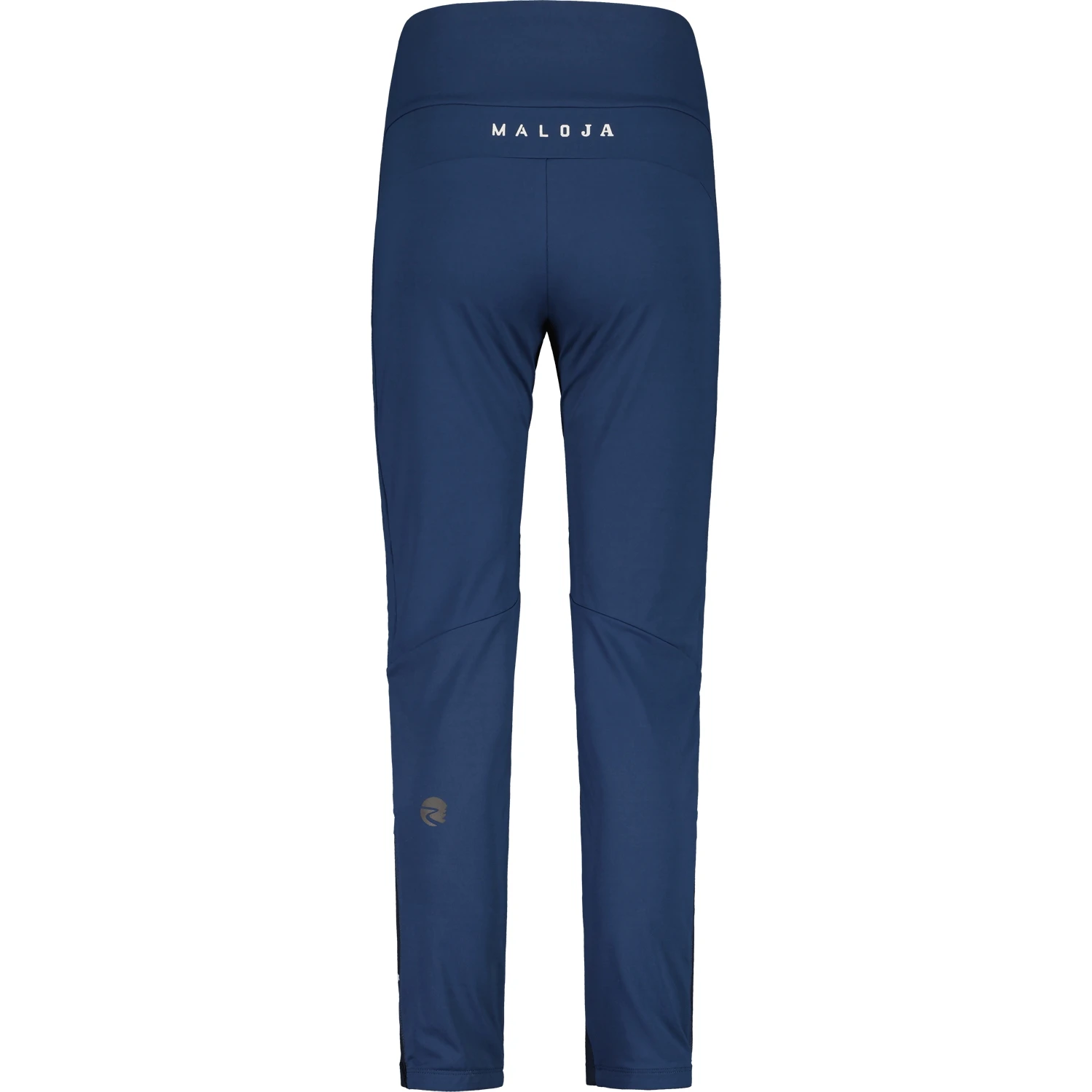 Maloja lettering across the bottom and on the left thigh, all over prints on the front of the legs.