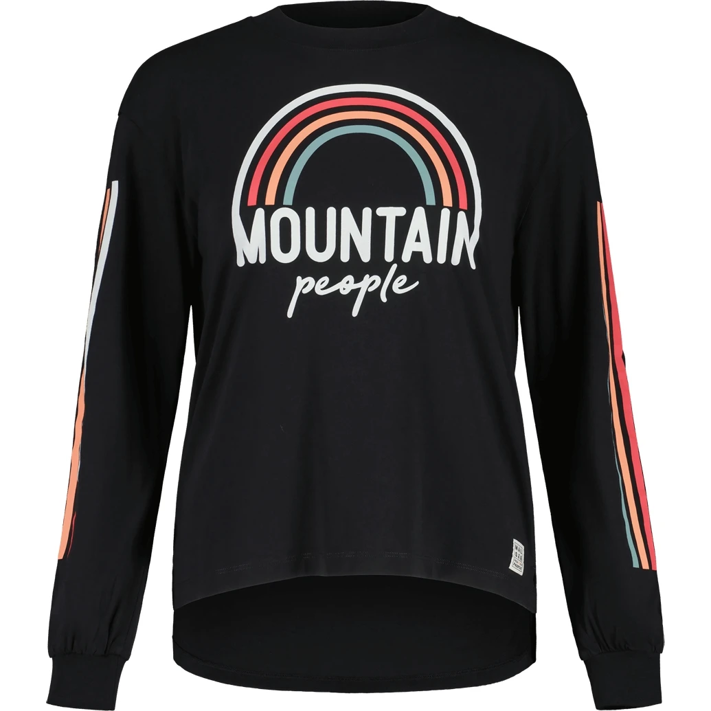 Organic cotton longsleeve with modern cut with extended back, high neck rib collar and puff sleeves, rainbow print on sleeves and chest.