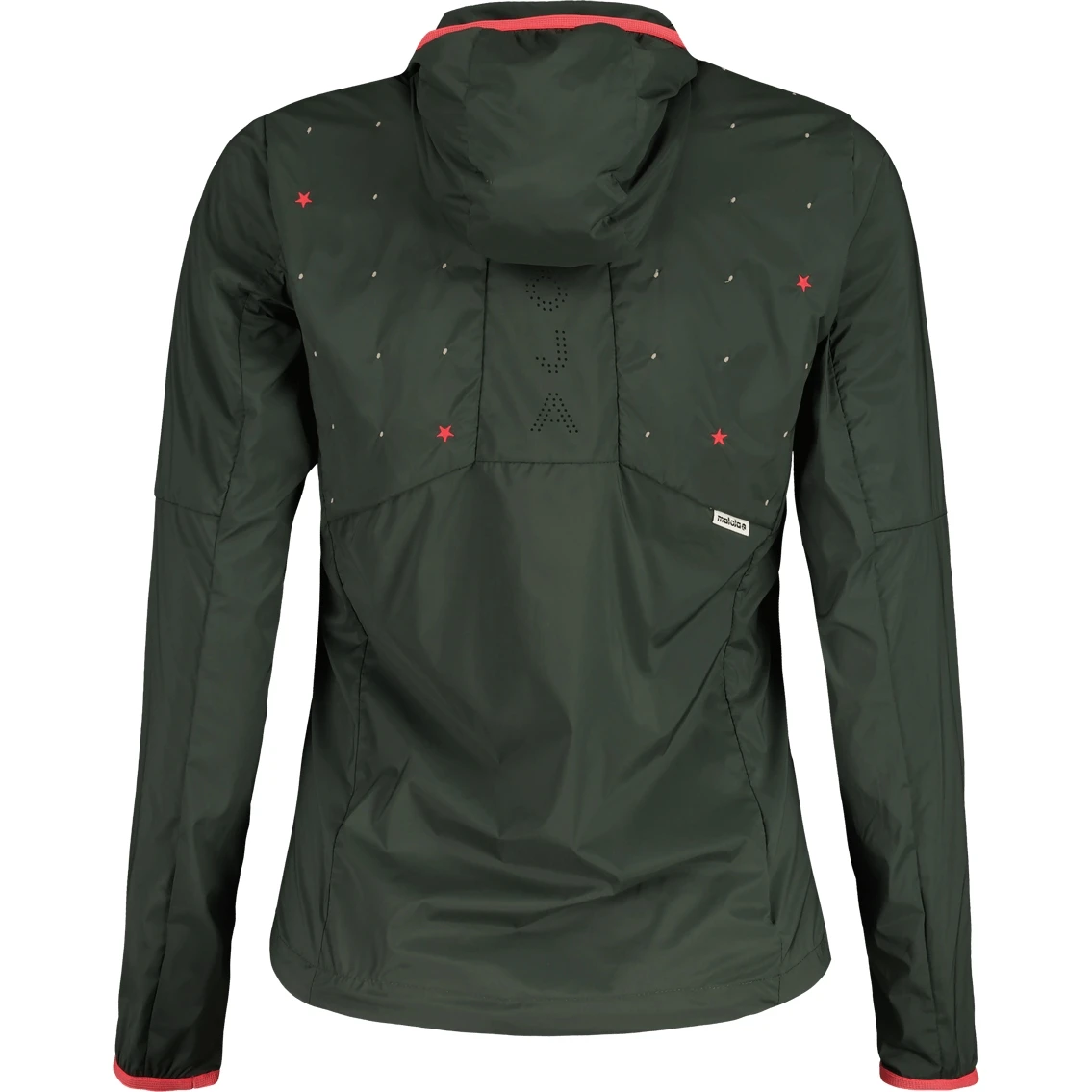 Reflective binding on the cuffs of the sleeves and hood, embroidered stars to fix the padding, round Maloja lettering on the left pocket.